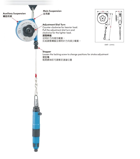 Spring Balancer là thiết bị chuyên dùng treo dụng cụ cầm tay khí nén, dụng cụ dùng điện…được thiết kế kiểu thu rút tự động có trợ lực giúp việc sắp xếp sử dụng thiết bị nhẹ nhàng thuận tiện hơn trong nhà xưởng. Ứng dụng cho các dây chuyền sản xuất giúp người dùng đỡ mỏi tay hơn khi dùng có thời gian thao tác lâu.