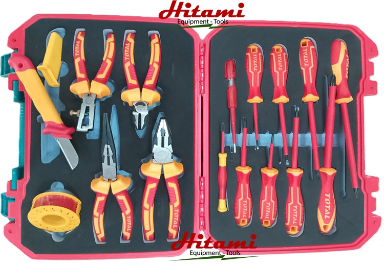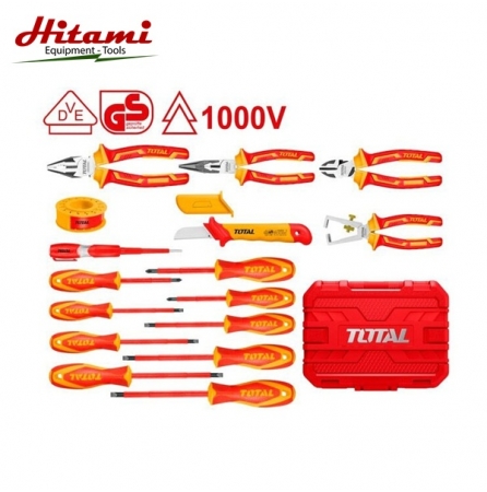 Bộ 16 dụng cụ cách điện Total THKITH1601 có Chứng nhận 1000V, VDE / GS bao gồm 16 chi tiết các loại kềm, dao tuốc dây, bộ tua vít, bút thử điện, băng keo chi tiết như sau: