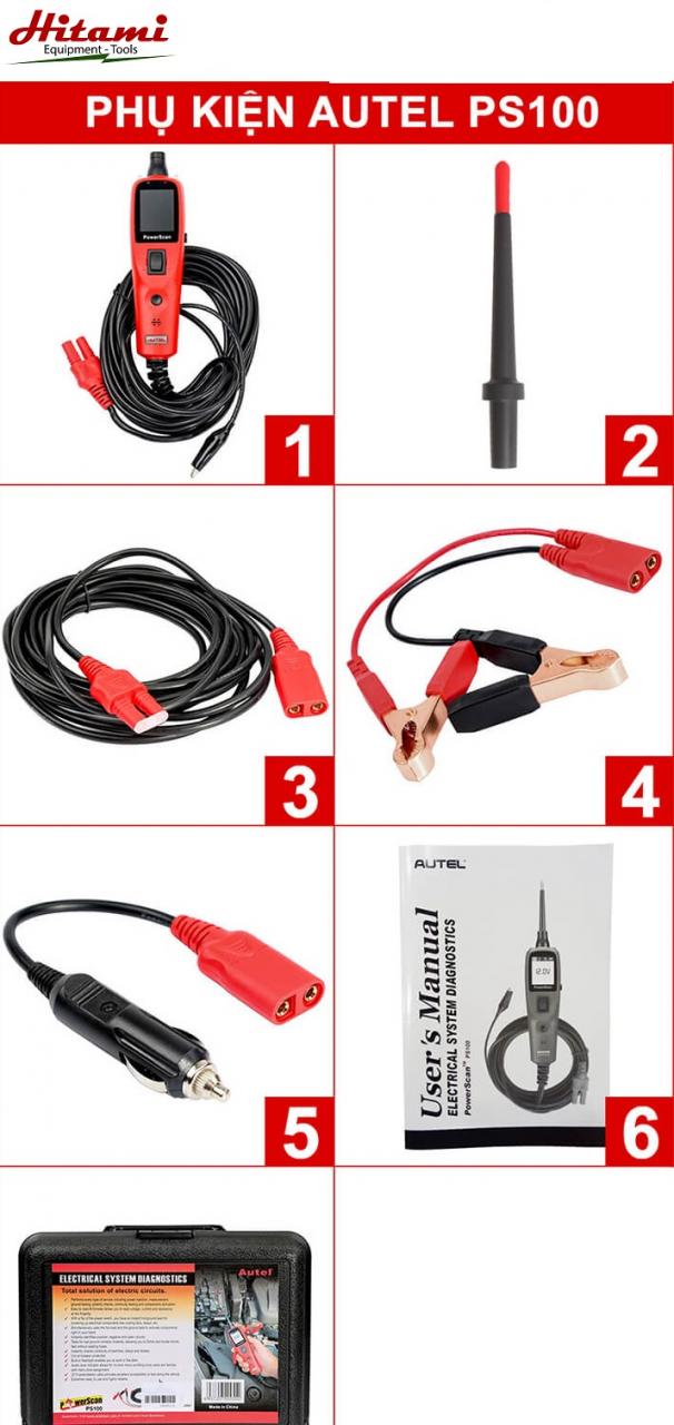 Bộ dụng cụ kiểm tra mạch điện ô tô, xe máy hãng sản xuất: Autel, model: PS100 với thiết kế như một đồng hồ đo điện áp VOM, có các chức năng kiểm tra được hệ thống đèn, xung tín hiệu, kiểm tra ngắn mạch, kiểm tra kích hoạt các rơle. Kết hợp các phụ kiện kèm với thao tác đơn giản cho phép người dùng kiểm tra hệ thống mạch điện một cách chính xác và nhanh chóng.