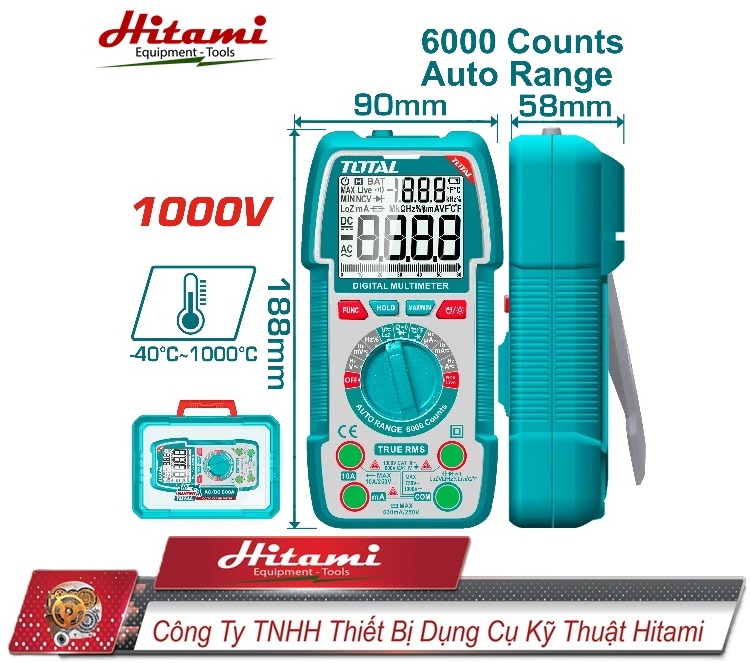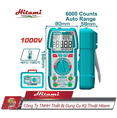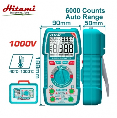 Đồng hồ vạn năng kỹ thuật số DC-AC Total TMT5310004 có chức năng đo nhiệt độ, hiển thị 6000 số đếm TRUR RMS, Phát hiện điện áp không tiếp xúc trực tiếp hoặc trung tính, ghi nhớ dữ liệu.