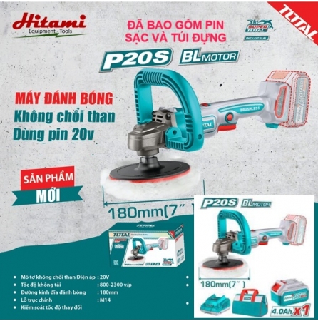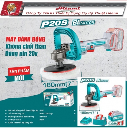 Máy đánh bóng không chổi than dùng pin 20V Total TAPLI20181 máy đã bao gồm 1 pin 20v 4Ah, 1 sạc nhanh, 1 giỏ đựng 1 tay cầm chữ D, 1 đĩa đánh bóng 180mm chuyên dùng cho các gara ô tô, chăm sóc xe…