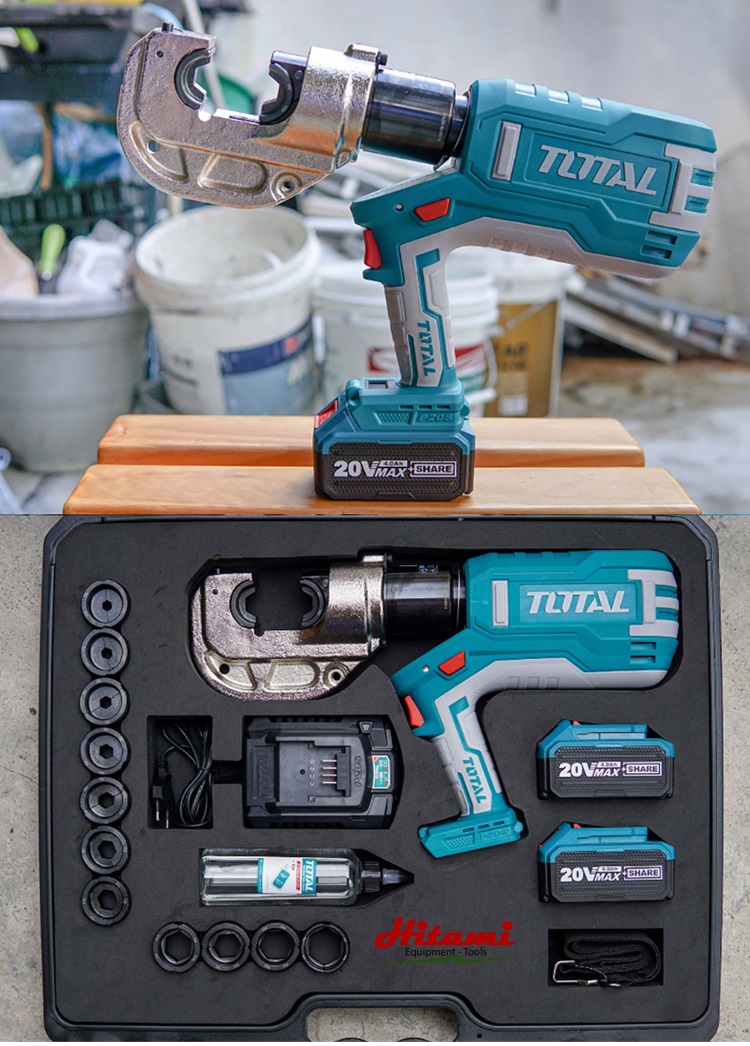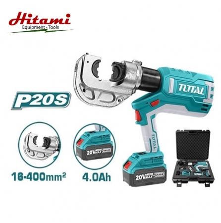 Máy ép cos thủy lực dùng pin Total TCLI2002 Điện thế : 20V, Phạm vi uốn: 16-400mm², Lực uốn: 120KN, Nhịp uốn: 42mm, kèm 2 pin 20V/4.0Ah.
