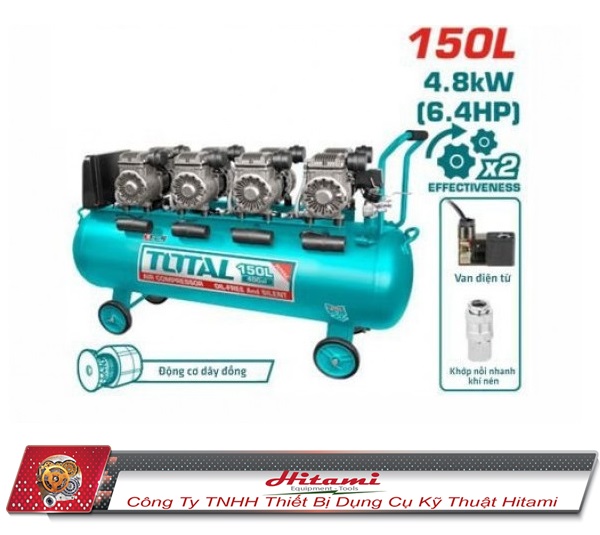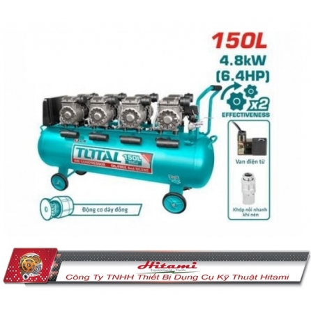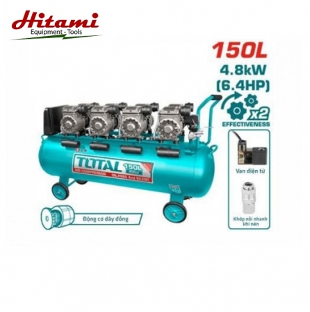 Máy nén khí không dầu 150 lít Total 4 động cơ motor dây đồng, tốc độ không tải 2850rpm, công suất đầu vào 4×1200W(6.4HP), áp suất 8, độ ồn 75db