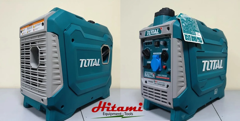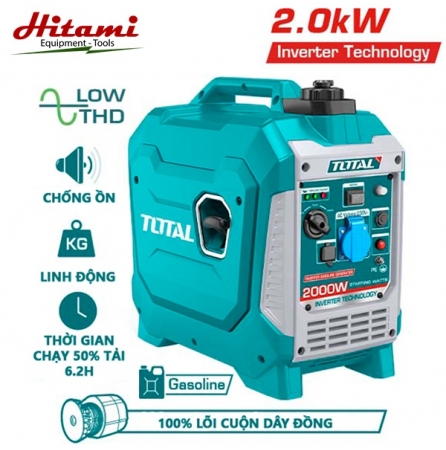 Máy phát điện biến tần 2 kw dùng xăng Total TP523006 sử dụng công nghệ biến tần, với cuộn dây 100% lõi đồng, Điện áp định mức: 220-240V/50Hz Động cơ dùng xăng: xi lanh đơn, 4 thì, 1 Ổ cắm: 250V/16AMP; 1 ổ cắm 12V DC/8AMP; 2 đầu cắm