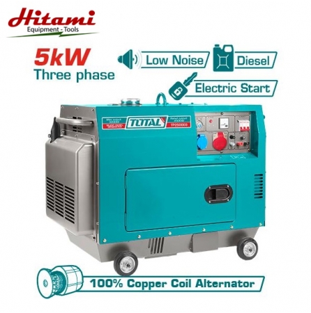 Máy phát điện Total 3 pha 5Kw TP250003 dùng dầu diesel Công suất liên tục: 4.5 KW Điện thế: 220/380V; Tần số:50 hz; 3 PHA khởi động đề độ ồn thấp.