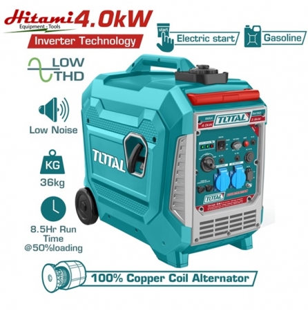 Máy phát điện Total TP547506E 4kw công nghệ biến tần động cơ dùng xăng với lõi cuộn dây máy phát làm từ 100% đồng, 2 Ổ cắm: 250V 16AMP, 1 ổcắm12V DC 8AMP. Hệ thống khởi động: Giật nổ + đề điện