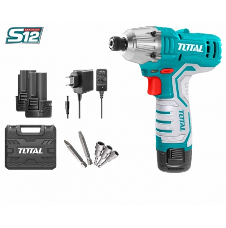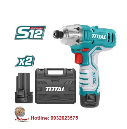 Súng bắn siết vít dùng pin litium total Lực siết tối đa: 100N/m, Đầu lục giác: 1/4″(6.35mm); có đèn Led, Kèm theo 2 pin x