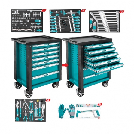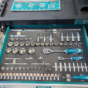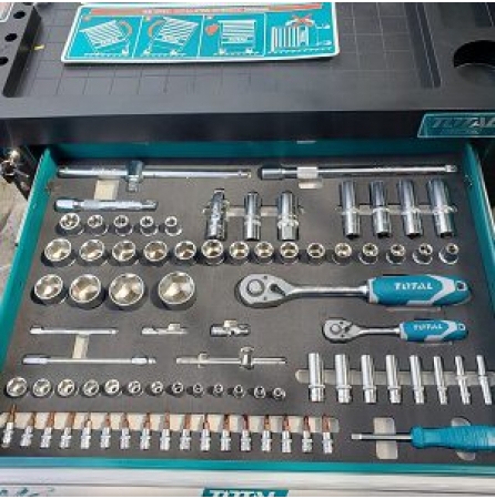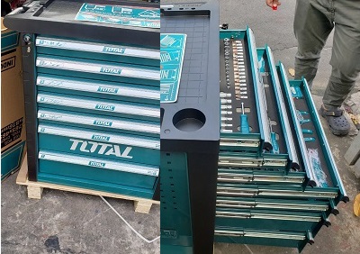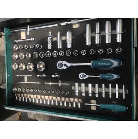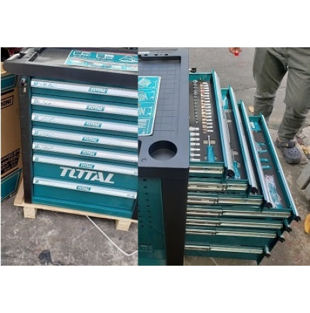 Tủ dụng cụ 7 ngăn bao gồm 162 chi tiết đựng trong 5 ngăn kéo đầu tiên. Total sản xuất theo tiêu chuẩn chất lượng Châu Âu. Chi tiết đồ nghề chuẩn xác, cảm giác cầm nắm chắc chắn.
