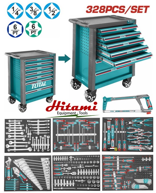 Tủ đồ nghề dụng cụ 7 ngăn 328 chi tiết Total model THPTCS73281 với 328 chi tiết dụng cụ kỹ thuật đựng trong 6 ngăn, đầy đủ các dụng cụ cơ bản dùng cho chuyên dùng cho các gara, bộ phận kỹ thuật bảo trì bảo dưỡng…